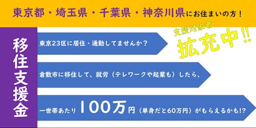 東京圏(東京都、埼玉県、千葉県、神奈川県)・大阪圏(大阪府、京都府、奈良県、兵庫県)に在住で、倉敷市へ移住を希望する方(移住又は、二地域居住を希望している方)が、市内で「採用面接」や「住居探し」の移住活動を行う場合に必要な交通費の一部を補助します!