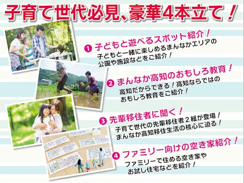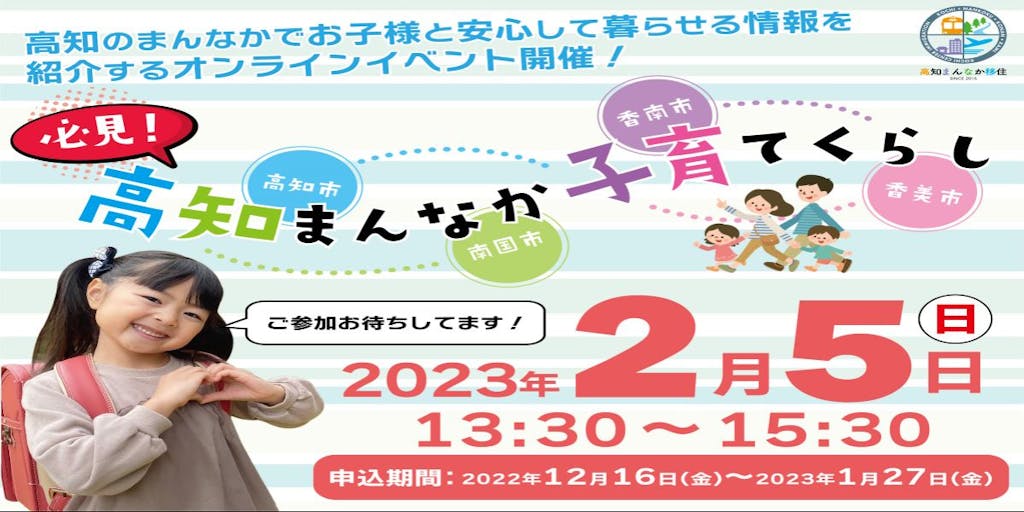 子育て世代の方をターゲットに高知まんなか4市の遊びスポット、おもしろ教育、空き家・お試し住宅の情報、また子育て世代の先輩移住者もゲスト出演!みなさまも気になる、まんなか高知の子育て移住生活を直撃! 今回はメインスタジオトークを中心に展開しますので、視聴するだけでもOK!(もちろんお顔を出さなくてもOKです。) このイベントを視聴していただいて、個別に相談をしたい方もイベント終了後、15分の2部制で個別相談タイムも設けます。 ぜひ、子育て世代のファミリーの方、ご参加お待ちしております!
