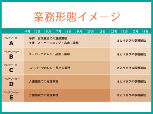 ※『MULTI WORKER(マルチワーカー)』 年間をとおして複数の仕事をすることから『MULTI=マルチ』と『WORKER=働き手』を組み合わせた造語