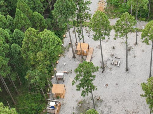 空中散歩を楽しんでいると、傍らで伊賀並さんが楽しそうな声を上げた。そう、このドローンおじさんはいつも笑顔で楽しそうだ。ドローンはぐんぐん高度を上げて、やがて、活動拠点から林道を800メートルほど進んだ山の上にある、キャンプ場に到着した。