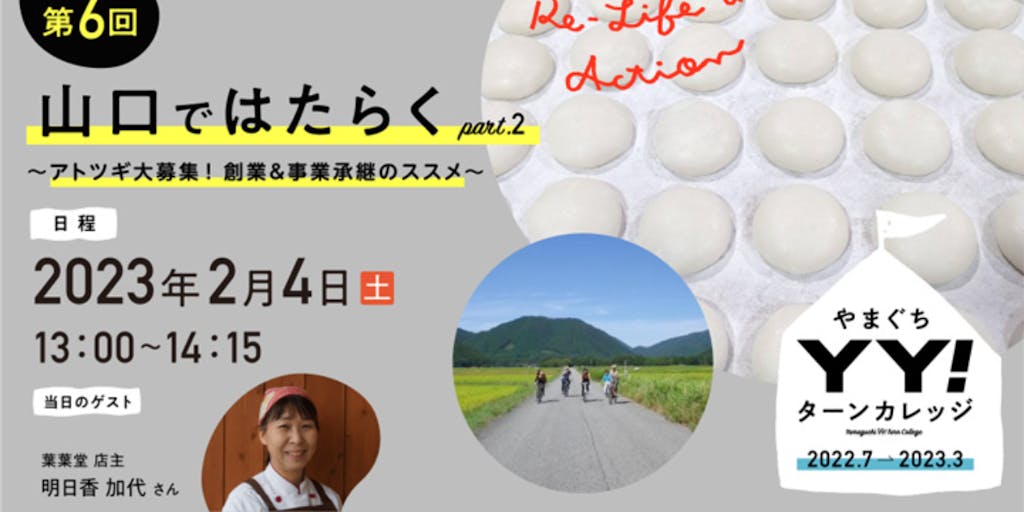 2023/01/28「やまぐちへの入口」をコンセプトとして、やまぐち暮らしの魅力を再発見していただく今年度のYY!ターンカレッジ。第6回目となる今回は「山口ではたらく」part.2として、「アトツギ大募集! 創業&事業承継のススメ」をテーマに東京交通会館(東京・有楽町)8階セミナールームで開催します。