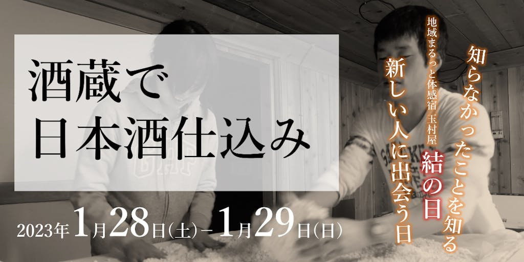 ・定員:4名 ・解散場所:地域まるっと体感宿 玉村屋 ・スケジュール: 【1日目】1月28日(土) 9:00 集合&ガイダンス 9:20 酒蔵で仕込み体験 12:00 昼食休憩 13:00 酒蔵で仕込み体験 16:00 終了&宿に戻る *希望者は温泉(別途650円)へ送迎 17:30 夕食づくり