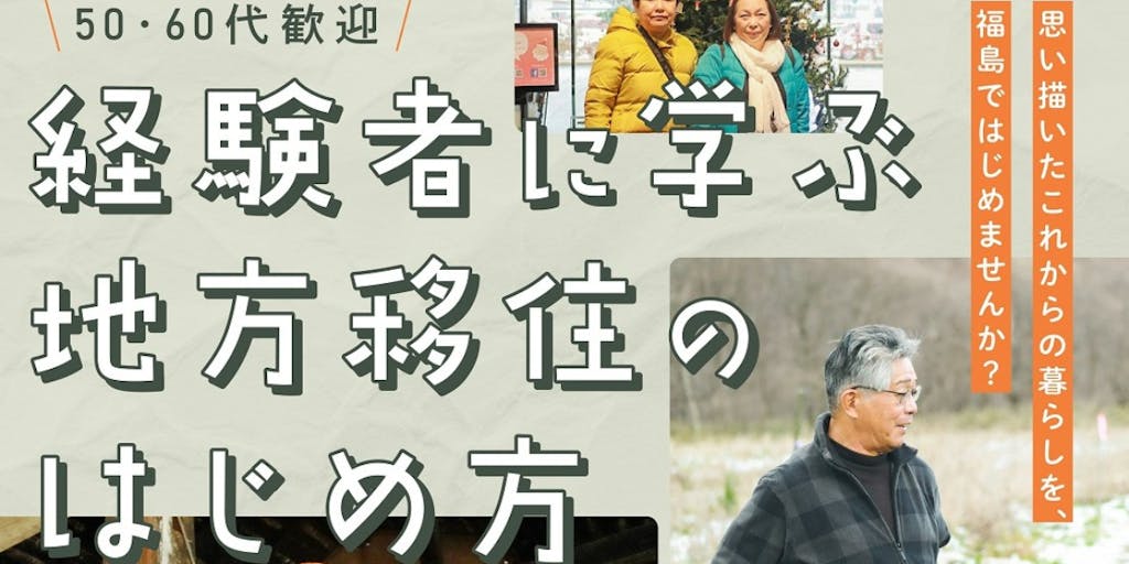 2023/01/26「子育てが終わったタイミングで田舎暮らしを。」、「早期に退職してやりたかったことを地方で。」など 福島県県南地域にはそのような考えを持って移住をされる50~60代の方が多くいらっしゃいます。 今回のイベントでは、実際に県南地域で暮らし始めた方をゲストにお招きし、なぜ福島県県南地域に移住したのか、移住するまでにどのようなことを考え、どのように行動を進めたのかなど実体験をお話いいただきます。 福島県県南地域がなぜ50~60代の方にとって選ばれているのか、いっしょにお話をお聞きしませんか。