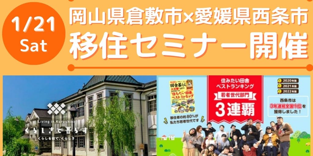 2023/01/21移住者に人気の「岡山県倉敷市」と「愛媛県西条市」が初コラボ移住セミナーを開催! 「瀬戸内海」をキーワードに似て非なる2つの市。どっちが住みよいまちなのか!? イベントでは、両市の概要や移住に関する支援制度の説明、ゲストの先輩移住者からの「移住までのこと」と「移住してからこと」などの話を聞くことができます。