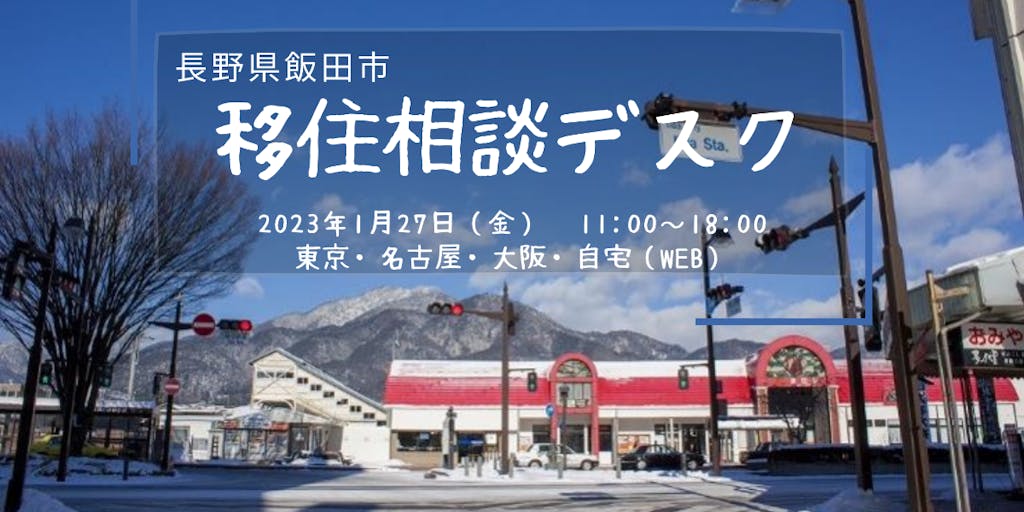 長野県や飯田市に興味がある方、地方移住を考えている方は是非お申し込みください。 あなたのやりたいこと、飯田で見つかるかもしれません( ^_^)/ ◆日時:2023年1月27日(金曜日) 11時00分~18時00分 ◆相談会場: ①東京:NPO法人ふるさと回帰支援センター 内 信州暮らしサポートデスク (東京都千代田区有楽町2-10-1 東京交通会館8階) ②名古屋:長野県名古屋事務所(久屋中日ビル4階) (愛知県名古屋市中区栄4-16-36 久屋中日ビル4階) ③大阪:長野県大阪事務所(大阪駅前第1ビル8階) (大阪府大阪市北区梅田1-3-1-800 大阪駅前第1ビル8階) ※自宅からオンラインで参加することも可能です。 ◆予約・申込 前日までに、「応募」または「興味ある」ボタンを押してくれた方全員に、申込用URLをお送りします。ご参加お待ちしています!