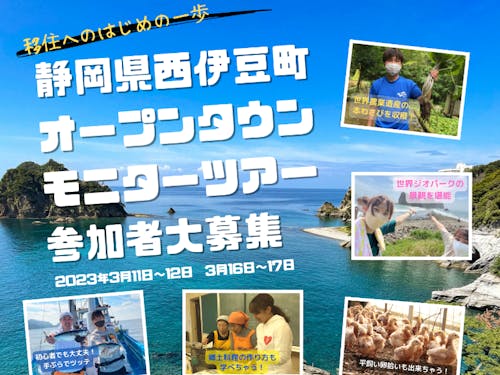 2023/07/24こんにちは! 西伊豆プロジェクトの高井です。 弊社では、町の産業の観光コンテンツ化と移住を結び付ける取り組みとして、【オープンタウン】という名称でイベントを展開すべく、この度モニターツアーを実施することと致しました。 移住を検討中で場所をお探しの方や、移住に興味は有るけれど何から動けばわからない人など、一般的な観光ではない"移住者目線"でのツアーに参加してみませんか?