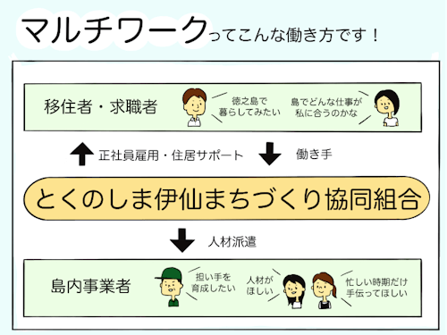 本募集は、総務省の特定地域づくり事業を活用した、『とくのしま伊仙まちづくり協同組合』にて勤務していただき、マルチワークという形で1年間に複数の事業者を巡り、働いていただく仕組みとなります。 https://www.soumu.go.jp/main_sosiki/jichi_gyousei/c-gyousei/tokutei_chiiki-dukuri-jigyou.html