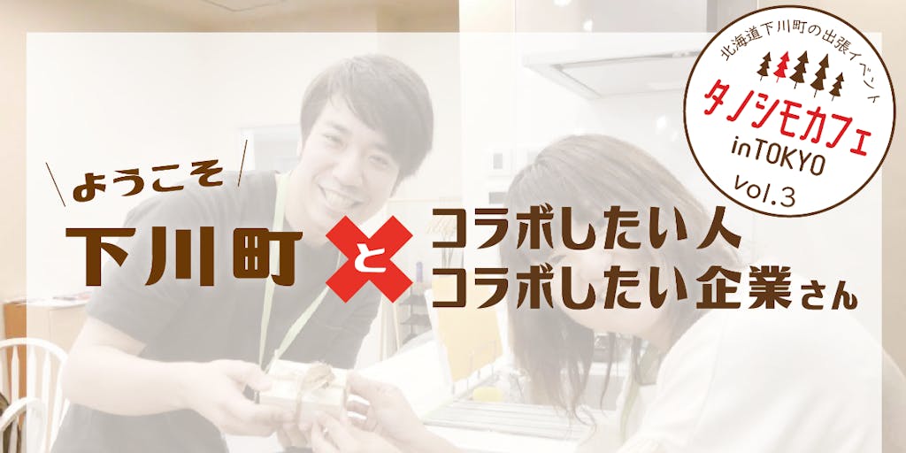 下川町民から下川ファンまで多くの方が参加するタノシモカフェでのゆるい出会いをきっかけに、事業の幅が広がったり、新しくつながった仲間とともにイベントに出店したり、おもしろい科学反応がおきるのがタノシモカフェの醍醐味。下川さながらのアットホームな雰囲気を東京で再現します! 今回のタノシモカフェinTOKYOのテーマは、下川町とコラボしたい人&企業さん。 下川チームも多くの町外企業や個人の方との繋がりづくりをしているメンバーが参戦します!