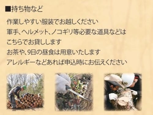 【スケジュール(予定)】 9:30~10:30 木を切って森を守るってどういうこと?(話と現地散策) 10:30~12:00 ノコギリによる木の伐採、後片付け 12:00~12:30 ぜんざいでいっぷく、ふりかえり ※小学生以下のお子様も参加可能ですが、保護者の方同伴でお願いいたします。 同日、落ち葉かき作業も行う予定をしています、お好きな方をお選びいただけます。