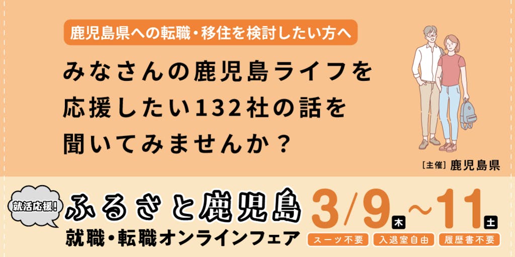 [対象]鹿児島県への就職を希望する方 ▶︎ 2024年3月卒業見込みの方(高校生除く) ▶︎ 鹿児島県へUIターンを希望している方 ▶︎ 鹿児島県内企業へ転職を検討中の方 ※2025年以降に卒業見込みの学生・保護者等の参加も歓迎です!