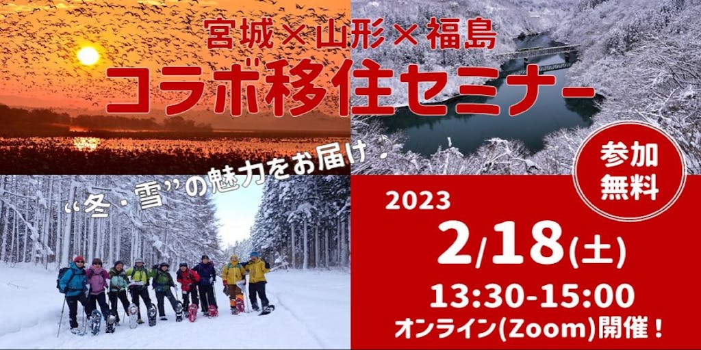 2023/02/17東北地方南部に位置する宮城・山形・福島の3県で、コラボ移住セミナーを実施します! セミナーテーマは「冬の南東北」 各県の地域的な特徴や、冬のアクティビティ、観光スポットなど、冬の南東北の楽しみ方をお届けします! アンケート回答者には、自宅で温泉気分を味わえる3県の入浴剤をプレゼント!