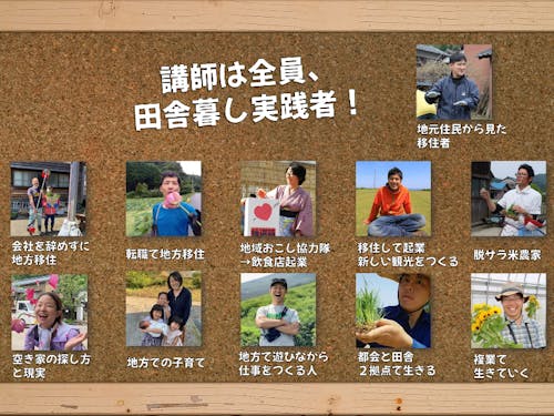 ☑ 講師は全員、田舎暮らし実践者たち。自分の経験をもとにリアルな話をしてくれます。 ☑ 移住に必要な基礎知識をまんべんなくカリキュラム化。移住で必要な情報を一通り知ることができます。 ☑単発参加OKなので、自分が興味あるテーマだけ参加できます! ☑ オンライン講座なので、全国どこでも、全世界どこでも受講可能。 ☑ 1年間で様々なテーマを取り上げます。受講期間中に自分自身で考えることで、より深い質問をして、地方移住実現への一歩が踏み出しやすくなっています。 ☑ 講座のインフォメーションを含め、受講生への連絡はLINEのオープンチャットを利用。 匿名性を確保しつつ、同じような段階の受講者同士でも情報交換をすることができます。