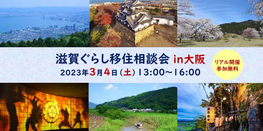 2023/03/02大阪暮らし情報センターで移住相談会を開催! 滋賀県内の6市町(大津市、彦根市、近江八幡市、甲賀市、東近江市、愛荘町)が参加し、東京のふるさと回帰支援センター内「しがIJU相談センター」のスタッフも駆けつけてくれます。 東近江市をはじめ各市町への移住に関する疑問や不安に、参加する各市町の相談員や担当者がお答えします。まだ何も具体的に決まっていなくても大丈夫。暮らしのこと、地域のこと、気になることなどお気軽にお聞きください。
