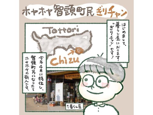 「新潟県出身、ぎりチャン!」イラストを描いています。 仲の良い友達が智頭町にいたため、移住を決意。暮らし屋のSNSで話題の「ぎりチャン日記」を展示します。その他、暮らす中で生まれたイラストやお仕事のイラストをご紹介します。