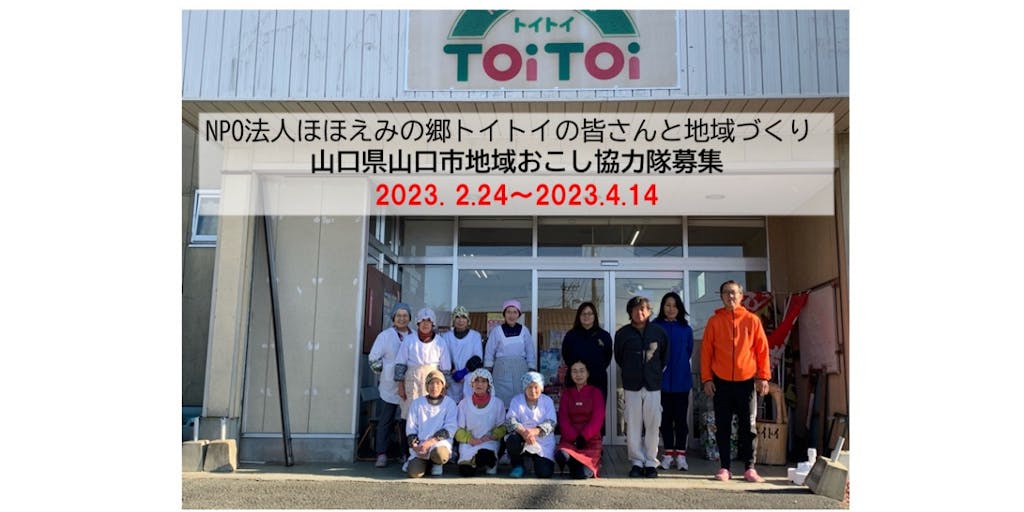 2023/04/14現在、山口市阿東地域にある地福地区では、地元女性の総菜加工グループ「トイトイ工房」の皆さんが、地域の方に幸せに暮らしてもらいたいという想いで地元野菜等を使用した惣菜や弁当を作っておられ、これらは中間支援団体が運営する店舗や約300人の方が利用する移動販売車等により地域全域に提供されています。 今後、買い物や調理が困難になる方の増加が予想される一方で、飲食店等は減少することが見込まれ、健康に暮らすために必須となる地域の「食」の重要度が高まる中ですが、トイトイ工房の皆さんが年齢等を考慮された上、令和5年3月末をもって辞められることとなりました。 こうしたことから、工房の味や想いを受け継ぎ発展させ、地域の生産から消費までの持続可能なしくみづくりや、新たな視点で「食」の課題解決に挑戦し、起業を目指してくださる方を地域のたっての希望から募集するものです。