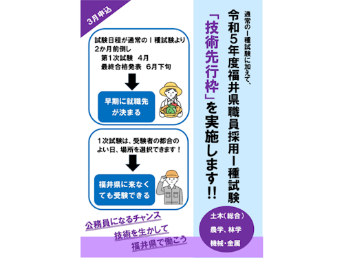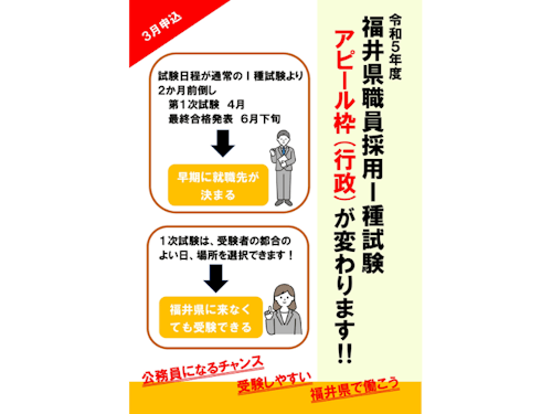 福井県職員Ⅰ種試験(アピール枠(行政))、Ⅰ種試験(技術先行枠)を実施します! (申込受付期間~3月22日(水))