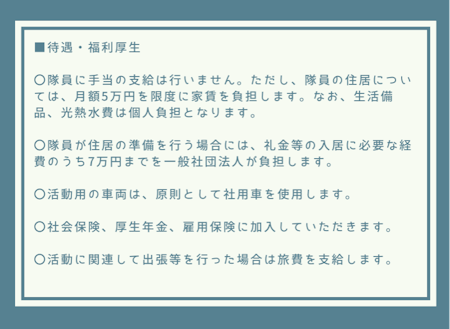 ■雇用形態・期間 ○地域おこし協力隊(一般社団法人まなびの未来づくり推進機構の任期付き職員)として勤務いただきます。 ○期間は1年毎更新・最長3年間は地域おこし協力隊としての雇用となります。