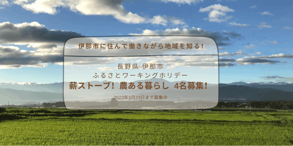 人生の大きな選択「移住」。実際にその地を知らずに移住先を決めることは難しいけど、今の生活を中断してまで探すことはできない、と一歩を踏み出せずにいるあなた。 長野県伊那市で「仕事」と「暮らし」を体験できる、ふるさとワーキングホリデーに参加してみませんか! 仕事をしながら、伊那市にいる間に、多くの人と出会っていただいたり、伊那の風土や魅力ある景観を楽しんでいただけるよう、お手伝いします。