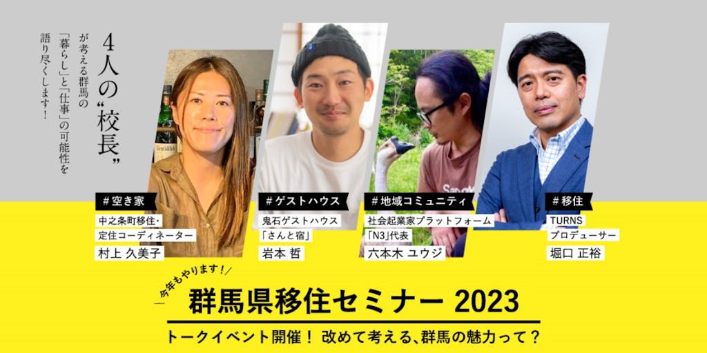 \プログラム内容/ 19:00 スタート 19:05 ゲスト紹介 19:20 【トークセミナー】空き家・ゲストハウス・地域コミュニティの視点で、群馬の魅力を学ぶ 20:15 【発表!】『TURNSのがっこう群馬科2023』今年学べる教科科目とは!? 20:30 終了