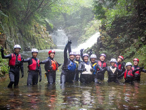 そして今後、湯来町をさらに楽しんでいただく&雇用創出の柱となると考えているのが、シャワークライミングという川でのアクティビティです。水内川という日本有数の清流の中を上流へと歩き、滝を登ったり滝壺にダイブしたり。仲間で助け合いながら冒険するアクティビティです。ただ楽しいだけではなく、チームビルディングや環境・防災、そして平和についても学ぶことができる、とても価値のあるアクティビティであると自負しています。