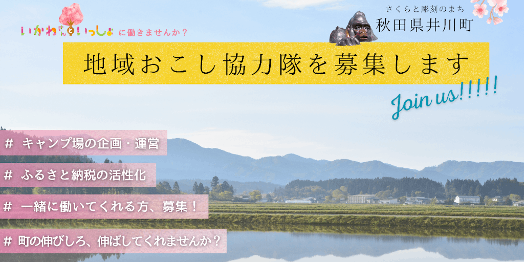 ■ 募集する活動内容 ・ キャンプ場の企画・運営 ・ ふるさと納税の活性化 ・ SNS等のプロモーションの活性化 ・ その他まちづくりに関する業務 ■ 募集人数 2 名 ■ 報酬 月額 188,999円(共済掛金、社会保険料含む) 期末手当 年2回支給 ■ 待遇、福利厚生等 ・ 社会保険(健康保険・厚生年金・雇用保険)に加入します。 ・ 住宅については、協議のうえ、決めていただきます。家賃については町で負担します。 ・ 活動する車両については町が準備し、無償で貸与します。 ■ 詳しい募集要項はこちら http://www.town.ikawa.akita.jp/docs/2023022200010/