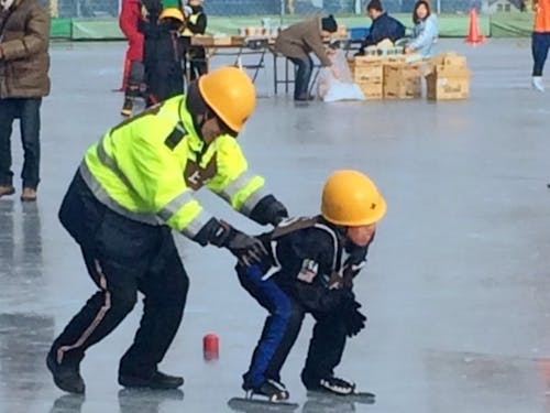 今回のプログラムは、そんな想いのこもったリンクで地元のこどもたちのように楽しんでもらいたい、という思いから企画されました。「スケートは初めて」という人には、地域のこどもたちにスケートを教えているコーチの方が、まずは氷の上での歩き方のレクチャーからスタートし、靴の履き方、滑り方とステップを踏んでていねいに教えてくれます。もちろん、自分で滑れる方は広々リンクを自由に滑ってOK♪ プログラムの後半では、リンクをつくり、整備しているみなさんから「小学校の校庭がリンクになるまで」の秘密が語られます。