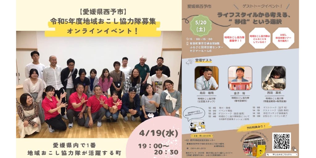 2023/05/12愛媛県内で最も多くの地域おこし協力隊が活動しているまち、西予市。今年度も募集が始まっています。 個人事業主型が特徴って見たけど、どういうこと? どんな活動ミッションがあるんだろう? みんなどんな活動をしているの? などなど、西予市の協力隊について詳しくお話しするイベントが二つあります!