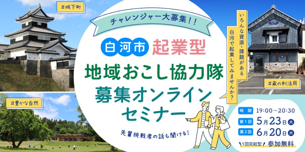 〇タイムスケジュール予定 19:00~19:05 オープニング 19:05~19:15 白河市の紹介および地域プレーヤー事業説明 19:15~19:35 地域おこし協力隊の募集について 19:35~20:00 地域プレーヤーの話 20:00~20:25 トークセッション 20:25~20:30 今後のイベント案内、応募方法について、アンケート