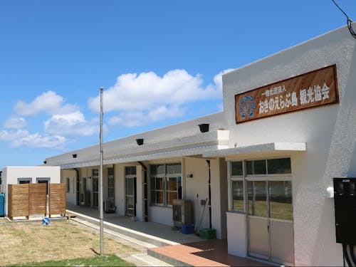 おきのえらぶ島観光協会が事務所を構える観光交流拠点施設『エラブココ』は、元保育園として使われていた場所。広々としたテラスや芝生の中庭の眼前は、遮るものなく海が広がる絶好のロケーションになっています。