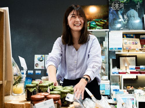 Q:観光協会では普段どんな仕事をしていますか? A:普段はお店番業務をしながら店内のディスプレイを整えたり、プライスカードやポップをつくったり、あとは毎月の物産事業者さんに対する精算業務も担当しています。店内ディスプレイはお客さまに見やすい配置となるように心がけていますね。そのほかには、観光協会オリジナルグッズの制作やスタッフの名刺デザイン,イベント関係のポスター制作などを行うことも多いです。