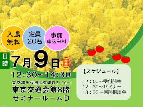 2023/07/07令和5年7月9日(日)に東京交通会館8階セミナールームDにて、セミナー&相談会を開催します。テーマは「農」ある暮らし! 仕事として農業を営む就農から個人で楽しむ家庭菜園まで、「農」にかかわることについて相談できます。当日は埼玉県から東近江市に移住して農ある暮らしを実践している移住者の方のお話が聞けます。 「入場無料」「定員20名」「事前申込み制」 豊かな自然環境の中で農業にかかわって暮らしたいと思っている方も、ちょっとだけ興味がある方も、ぜひご参加ください。 ※申込みを希望される方は「興味ある」を押してください!!