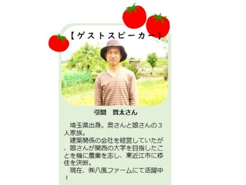 「農」ある暮らしといっても、家庭菜園から農業を生業として就農を目指す方などいろいろなケースが考えられます。 今回のセミナー&相談会はそれぞれが目指す「農」に合わせて相談できます。前半のセミナーでは、実際に移住され農ある暮らしを実践されている方をゲストスピーカーとしてお呼びし、話をしていただきます。埼玉県から東近江市に移住され、農業法人で活躍中の方です。農業を目指すきっかけや苦労したこと、住居をどうやって探したかなどのお話が聞けます。 後半の相談会では、市の農業水産課の担当者、定住移住の担当者が個別の相談に対応させていただきます。