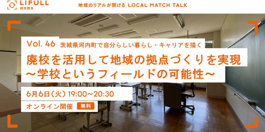 ▼当日スケジュール 19:00 開会 (ZOOM開始) 19:05 挨拶 19:10 LIFULL 地方創生の紹介 19:20 河内町役場によるプレゼン ∟河内町の紹介 ∟廃校活用の取組み紹介 ∟寺子屋かわちの取組み紹介 ∟かわち夢楽の取組み紹介 19:35 リングローさんによるプレゼン ∟自己紹介 ∟自社の取組み紹介 ∟河内町での取り組み紹介 ∟今後の展望について 19:55 トークセッション&質疑応答 20:25 地域おこし協力隊募集の告知 20:30 閉会