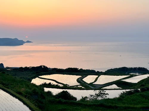 ベストシーズンは田んぼの水面が夕日に映える5月下旬から6月上旬頃までですが、8月まではイカ釣り漁船の漁火が美しい光景が続きます。
