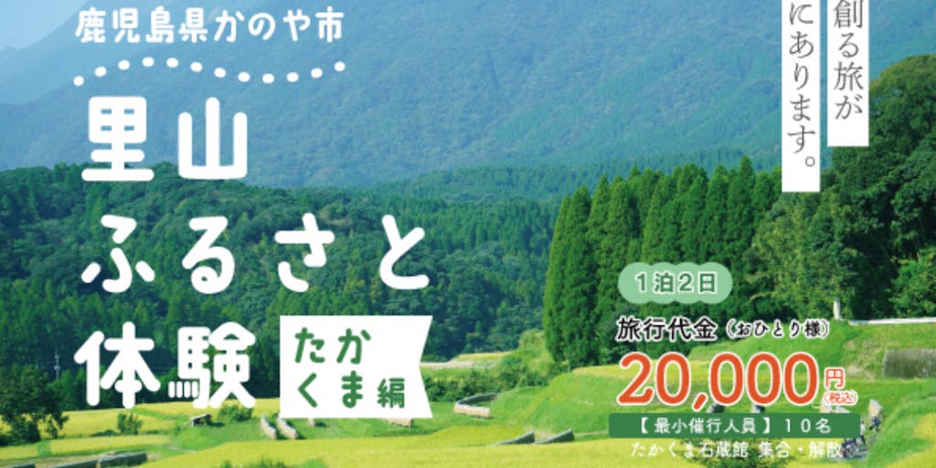 2024/02/15日本の原風景が広がる鹿児島県鹿屋市高隈地区で里山ふるさと体験ができるツアーを開催します。 地元行事参加や季節感のある食と体験、農家民泊などの宿泊をパッケージしております。 ツアーは、全部で3回開催されます。 第1回 2023年6月10日~11日 第2回 2023年10月14日~15日 第3回 2023年2月18日~19日 ※申込期限は、ツアー開催日の3日前までになります。
