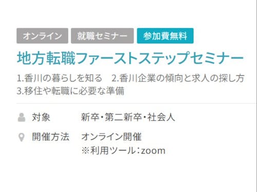 移住をし生活を始めるためには色々ハードルがありますが、一番高いハードルは「転職」では ないでしょうか?求人情報だけであれば検索サイトやハローワークなどのオンライン求人など で確認することが可能です。私たち「瀬戸・たかまつ移住&キャリアサポートセンター」では 求人情報だけでは分かりにくい、転就職に関する情報を分かりやすく、気軽にご参加いただけ るカリキュラムをご用意しています。