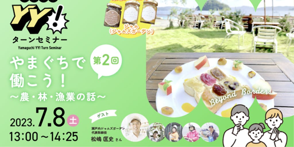 2023/06/29「Beyond Borders-移住で世界を広げよう-」をコンセプトとして、「やまぐち暮らし」の魅力を発見していただく「YY!ターンセミナー」。 第2回目は初の福岡開催!「やまぐちで働こう!」をテーマにTKPガーデンシティ博多新幹線口4階「4-A」で開催します。 ご自身も移住者で、人気のジャム店「瀬戸内ジャムズガーデン」を経営されている松嶋さんと、農・林・漁業で働かれている4人をゲストにお迎えして、さまざまな働き方についてお話ししていただきます!