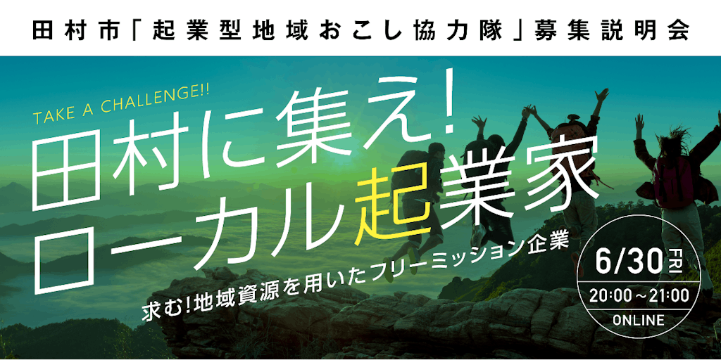 20:00 オープニング&田村市と事業の説明 25分 20:25 Q&A 25分 20:50これからのスケジュール/応募方法について 10分 21:00 クロージング