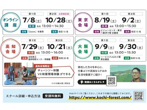2023/10/27「こうちフォレストスクール」は、林業の基礎知識や高知県の林業の特徴を学べるワークショップです。 今年は東京・大阪・高知・オンラインで計8回開催し、林業に従事している先輩講師をゲストに招いたトークセッションや林業の基礎がわかるミニセミナーを行います。 高知会場では、チェーンソー体験やVR林業現場体験(第2回のみ)等の体験コーナーも開催します。 林業就業への第一歩として、まずはお気軽に参加してみませんか。