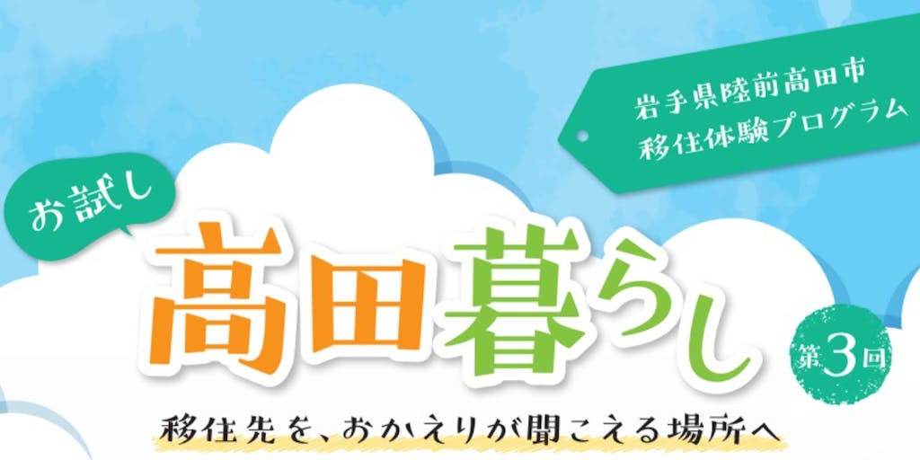 ・定員:8名 ・最小催行人数:6名 ・解散場所:JR一ノ関駅 東口 ・スケジュール: ①9月9日(土) 19:00-20:30 「事前オンライン交流会」 ②9月16日(土)ー9月18日(月・祝)「お試し高田暮らし」 . ◆少しでもご興味がありましたら、参加の可否を問わず、ぜひ「興味ある」ボタンをクリックください! . ◆「すぐに参加を申し込みたい!」という方は、下記から参加のお申し込みをお待ちしております。(所要時間:5分程度) https://forms.gle/BsgoRWb6YKt5R5tEA . ※申込時には、下記「実施要項」を必ずご確認いただくようお願いいたします。 https://www.city.rikuzentakata.iwate.jp/material/files/group/29/zissiyoko.pdf