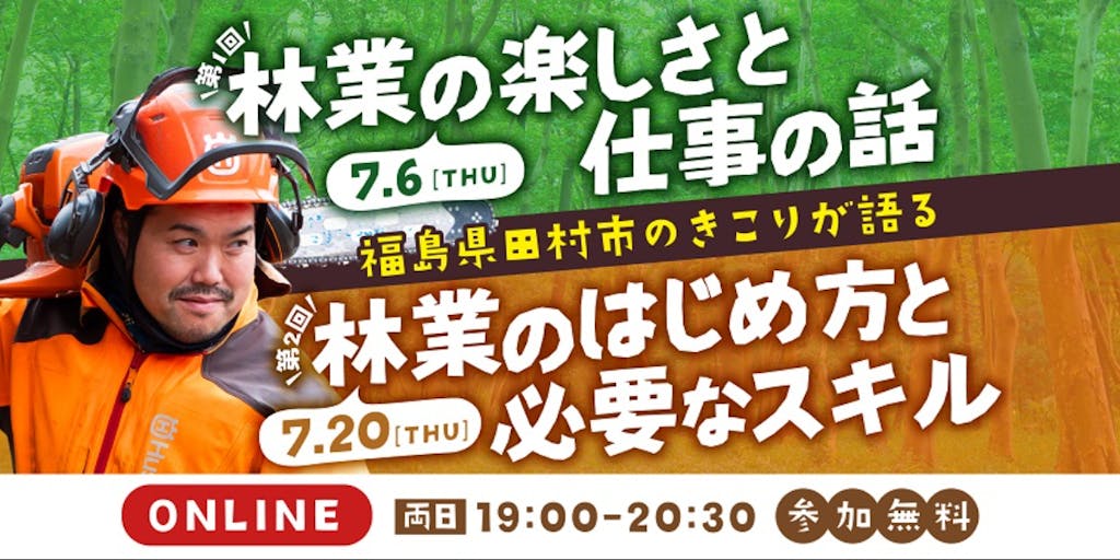 【福島県田村市オンライントークイベント】 林業の魅力や林業のはじめ方のお話をきいてみませんか? このオンラインイベントでは、田村市の現役のきこり(林業従事者)たちが登壇し、第1回は「林業の楽しさと仕事の話」をテーマに林業の楽しさや仕事の魅力について、第2回は「林業のはじめ方と必要なスキル」についてを現場ならではのお話します。