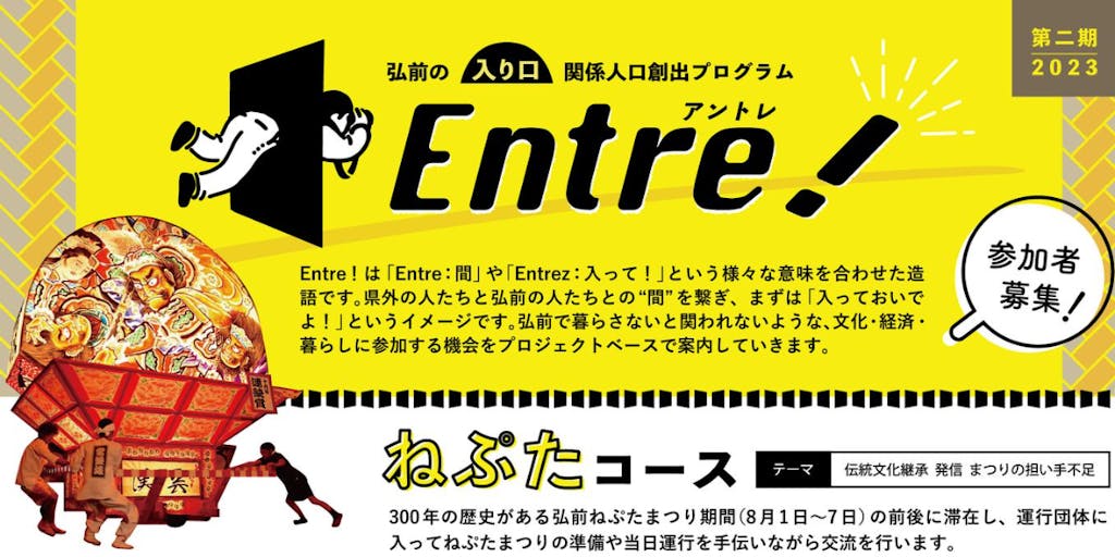 弘前に関わるための“入り口”として、好奇心を刺激する出会いや学び、新たな関わりの機会をつくる関係人口創出プログラム「Entre!(読み:アントレ)」。県外の人たちと弘前の人たちとの“間”を繋ぎ、弘前で暮らさないと関われないような、文化・経済・暮らしに参加するきっかけをつくるプロジェクトです。