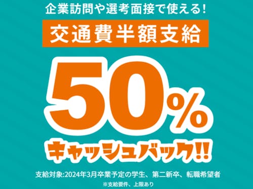 WEB面談後、企業訪問をされた方に交通費50%キャッシュバック! これは参加しないともったいない! ※支給要件、上限がございます