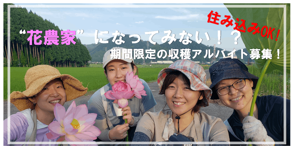 今回のプロジェクトでは、古くからこの地で花ハスを栽培する井上さんと、若手で、移住し花農家となった野村さんのお手伝いを通じて、「移住して農家に興味がある」方が“農家”という仕事を知るきっかけにしていただければと考えています。