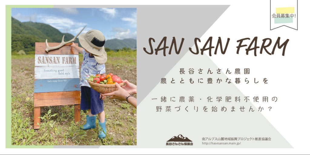 2024/03/31こんにちは!長谷さんさん農園です。 長谷さんさん農園は、長谷公民館前を中心に約30アールの畑で栽培期間中農薬・化学肥料不使用の栽培に挑戦しています。「農ある暮らしの第一歩を応援する」をテーマに、会費制でみんなで畑を耕す共同管理と、自分の好きな作物を栽培できる市民農園(区画管理)を運営しています。