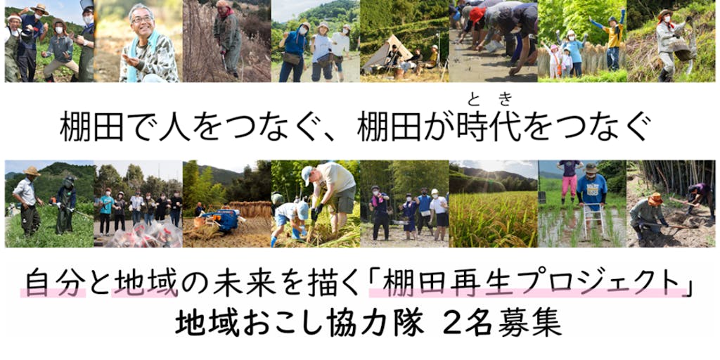 【中心となる業務の内容例】 Ⅰ)棚田の再生・維持管理活動(1名) ・棚田の新規再生 ・再生した棚田の維持管理 ・棚田サポーターズ(登録制ボランティア)等を受け入れて行う上記活動の準備 など ※その他、農作業に付随する作業や準備なども範囲です。