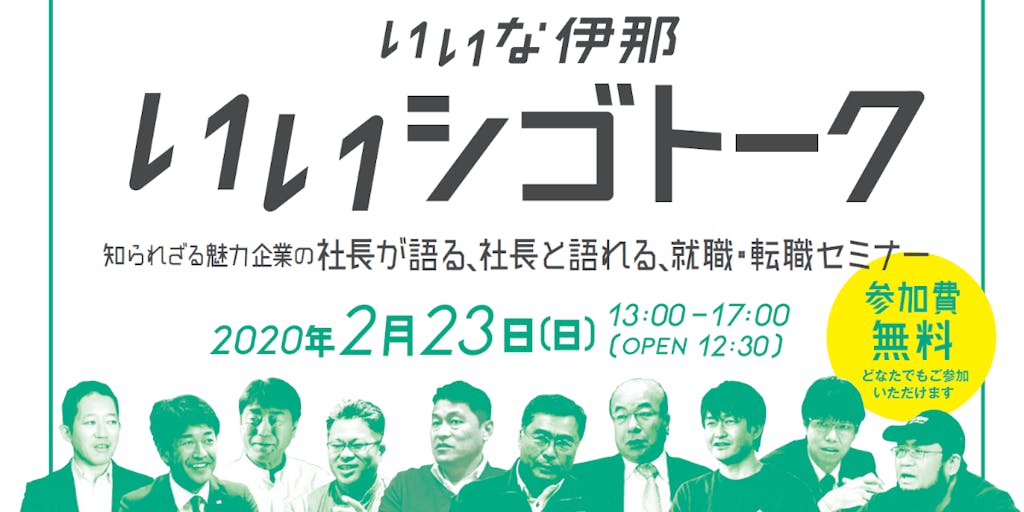 「いいな伊那 いいシゴトーク」 日時:2020年2月23日(日)13:00~17:00(OPEN 12:30) 会場:TKP新宿カンファレンスセンター 参加費:無料