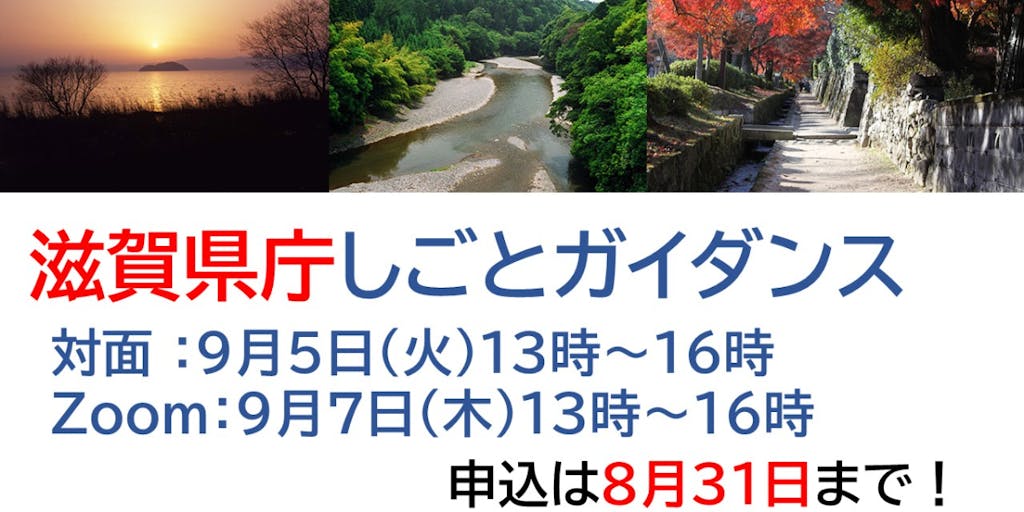 2023/08/31滋賀県庁では様々な職種で職員の採用を行っており、滋賀県への移住を検討されている方にも是非採用試験を受験していただきたいと考えています! そこで、県庁の仕事の魅力や働きやすさを知っていただくため、県の組織や業務内容、先輩職員との座談会などを盛り込んだガイダンスを開催します。 WEB(Zoom)でも実施しますので、遠方にお住まいの方も気軽にご参加ください。