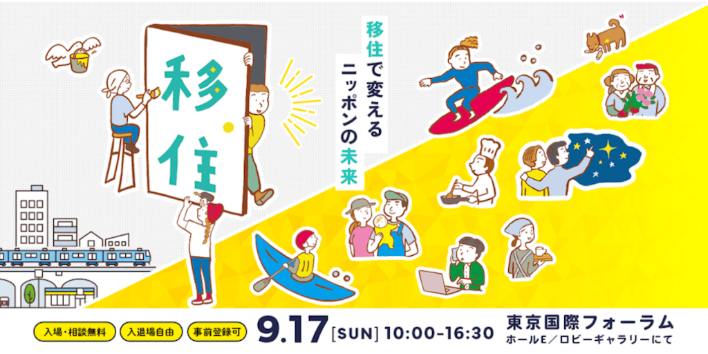 開催日時:令和5年9月17日(日) 10:00~16:30 開催場所:東京国際フォーラム ホールE/ロビーギャラリー JR・東京メトロ有楽町駅より徒歩1分 地下コンコースにて連絡 (〒100-0005 東京都千代田区丸の内3丁目5番1号) 内 容:全国移住相談ブース ミニセミナーinふるさと回帰フェア「地方移住初心者向けセミナー」 地方暮らし応援コーナー 日本全国ふるさとマルシェ など