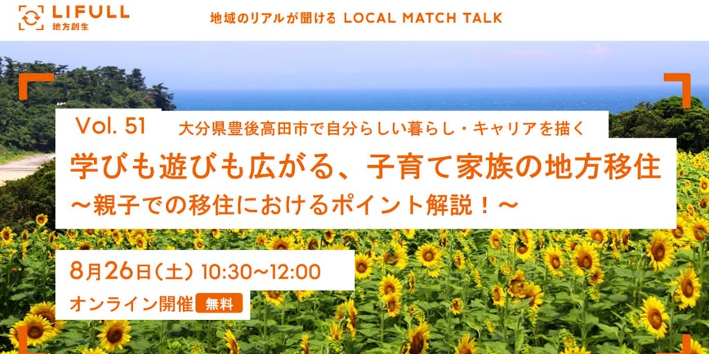 2023/08/23毎回さまざまなテーマを取り上げきたLOCAL MATCH TALK。 vol.51の今回は、学びも遊びも広がる、子育て家族の地方移住~親子での移住におけるポイント解説!~をテーマに、子育てを地域が一体になって支える豊後高田市の移住制度や現状を紹介します。 さらに、子育てママ&先輩移住者さん座談会ではお二人の先輩移住者にご登壇いただき、豊後高田市でのリアルな子育て事情や、子供と移住するうえでのポイントなどを伺います!